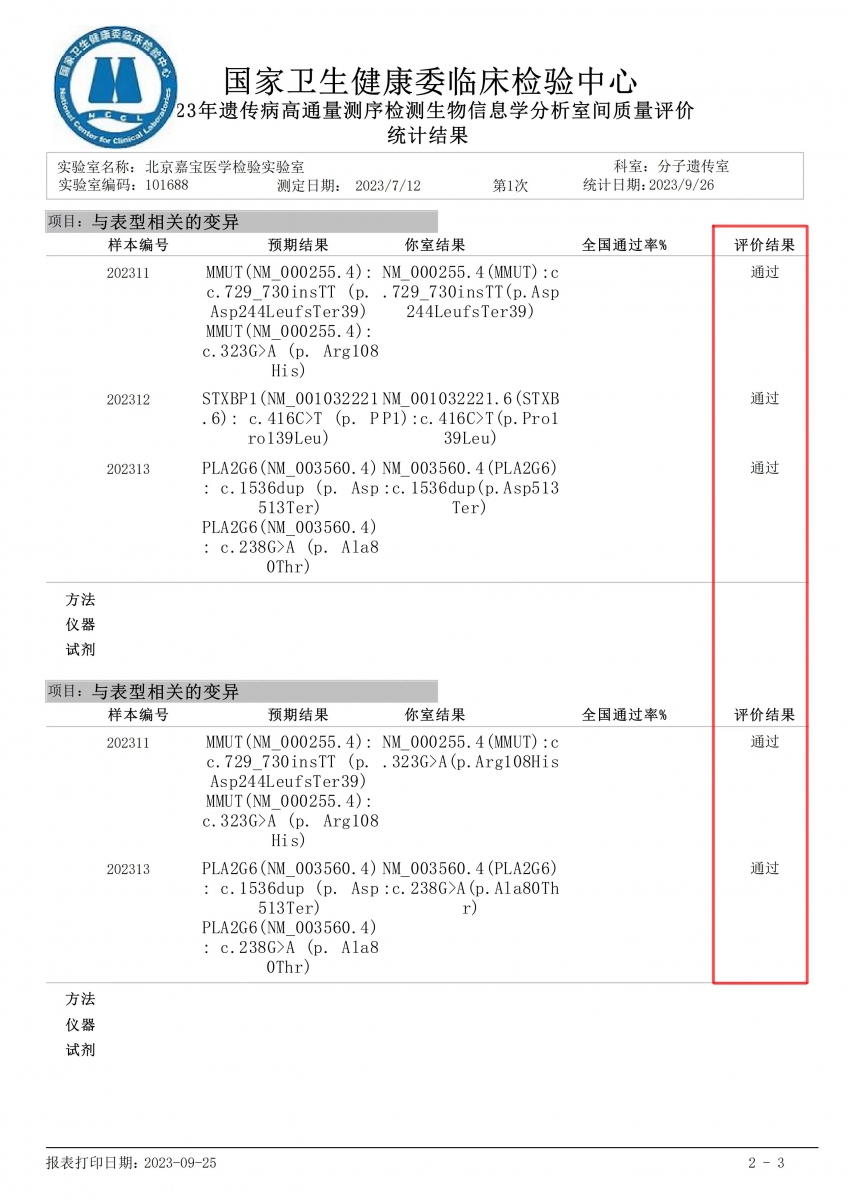 近日,國家衛(wèi)生健康委臨床檢驗中心(NCCL)公布了2023年全國臨床檢驗室間質(zhì)量評價結(jié)果,嘉寶仁和旗下北京嘉寶醫(yī)學(xué)檢驗實驗室《2023年染色體基因組結(jié)構(gòu)異常室間質(zhì)量評價》和《2023年遺傳病高通量測序檢測生物信息學(xué)分析室間質(zhì)量評價》均滿分通過。這是嘉寶醫(yī)學(xué)檢驗實驗室自2019年以來連續(xù)第五年以滿分的成績通過NCCL室間質(zhì)量評價。