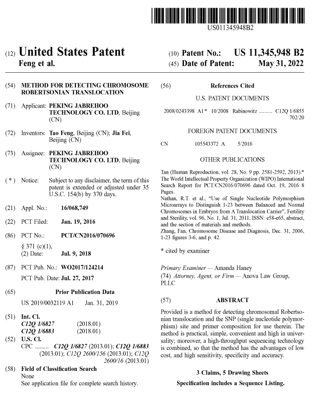 嘉寶仁和S-PGD“一種檢測(cè)染色體羅氏易位的方法”早在2016年獲得國(guó)家專利授權(quán)( 201610034367.4),近日該技術(shù)再獲美國(guó)專利授權(quán)。