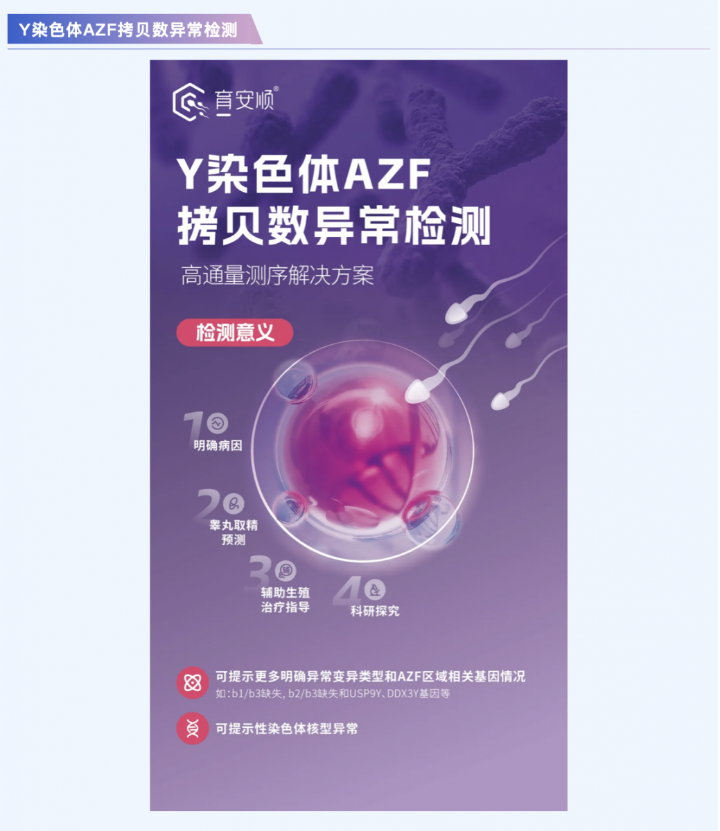 育安順®Y染色體AZF拷貝數(shù)異常檢測,結(jié)合目標(biāo)區(qū)域捕獲技術(shù)及高通量測序技術(shù),采用Y染色體AZF區(qū)微缺失檢測試劑盒(專利號ZL 2015 1 0679999.1),檢測AZF區(qū)域拷貝數(shù)異常(缺失、重復(fù)、倒位等)的具體區(qū)域和大小以及相關(guān)基因情況,從而為男性不育患者提供科學(xué)的臨床治療方案和遺傳咨詢指導(dǎo)。