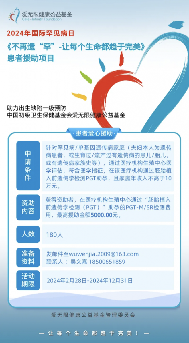 《不再遺“罕”—讓每個(gè)生命都趨于完美》患者公益援助項(xiàng)目,于2024年2月28日再次揚(yáng)帆起航,通過PGT(胚胎植入前遺傳學(xué)檢測)技術(shù),“剔除”攜帶致病基因突變的胚胎,選擇健康胚胎植入母親體內(nèi),從根源上阻斷單基因病在家族中發(fā)生,避免妊娠有“病”胎兒,以及反復(fù)人工流產(chǎn)或者引產(chǎn)導(dǎo)致的身體、精神上的創(chuàng)傷和經(jīng)濟(jì)損失,為阻斷遺傳病的傳播提供了第一道強(qiáng)有力的安全屏障,幫助更多的遺傳病家庭完成生育健康寶寶的愿望,使更多夫婦、家庭乃至社會(huì)受益,全面保障家庭健康和家庭生育健康,降低出生缺陷發(fā)生率。為有需求的家庭提供堅(jiān)實(shí)的依靠,使更多經(jīng)濟(jì)困難的單基因病家庭獲得先進(jìn)技術(shù)和診療方案的幫助,全面保障家庭健康和家庭生育健康,降低出生缺陷的發(fā)生率。